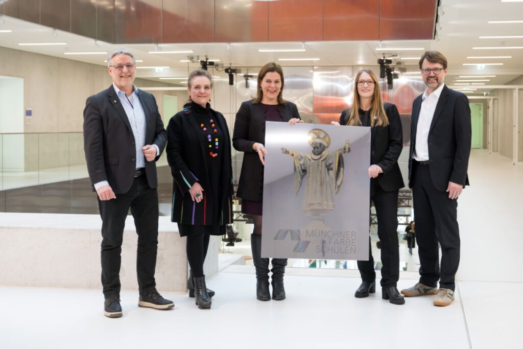 Schüler*innen der Städtischen Berufsschule für Farbe und Gestaltung (Fachklasse für Schilder- und Lichtreklamehersteller, zweites Lehrjahr), Dieter Reiter (Oberbürgermeister der Landeshauptstadt München), Dr.-Ing. Jeanne-Marie Ehbauer (Baureferentin der Landeshauptstadt München), Florian Kraus (Stadtschulrat der Landeshauptstadt München), OStDin Miriam Maier (Schulleiterin Städtische Berufsschule für Farbe und Gestaltung), StR Andreas Mittner (Projektinitiator und Koordinator Städtische Berufsschule für Farbe und Gestaltung), FOL Stefan Koch (Fachlehrer Städtische Berufsschule für Farbe und Gestaltung), Barbara Berger (Firma Avery Dennison)